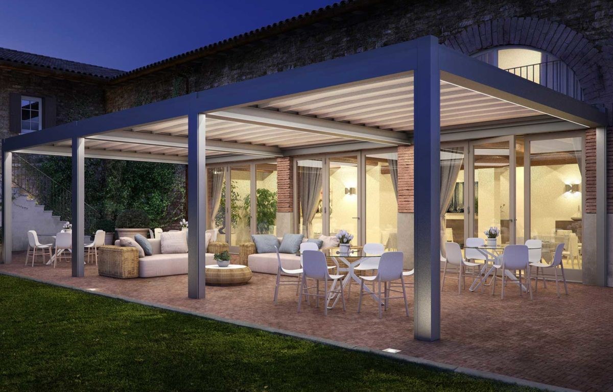 Rialto är en modern stilren pergola med indragbar takduk (så kallad ”soft top”), detta gör att man kan njuta av solen samtidigt som takduken med ett knapptryck enkelt kan skjutas ut när man vill ha skugga eller skydd från regn.